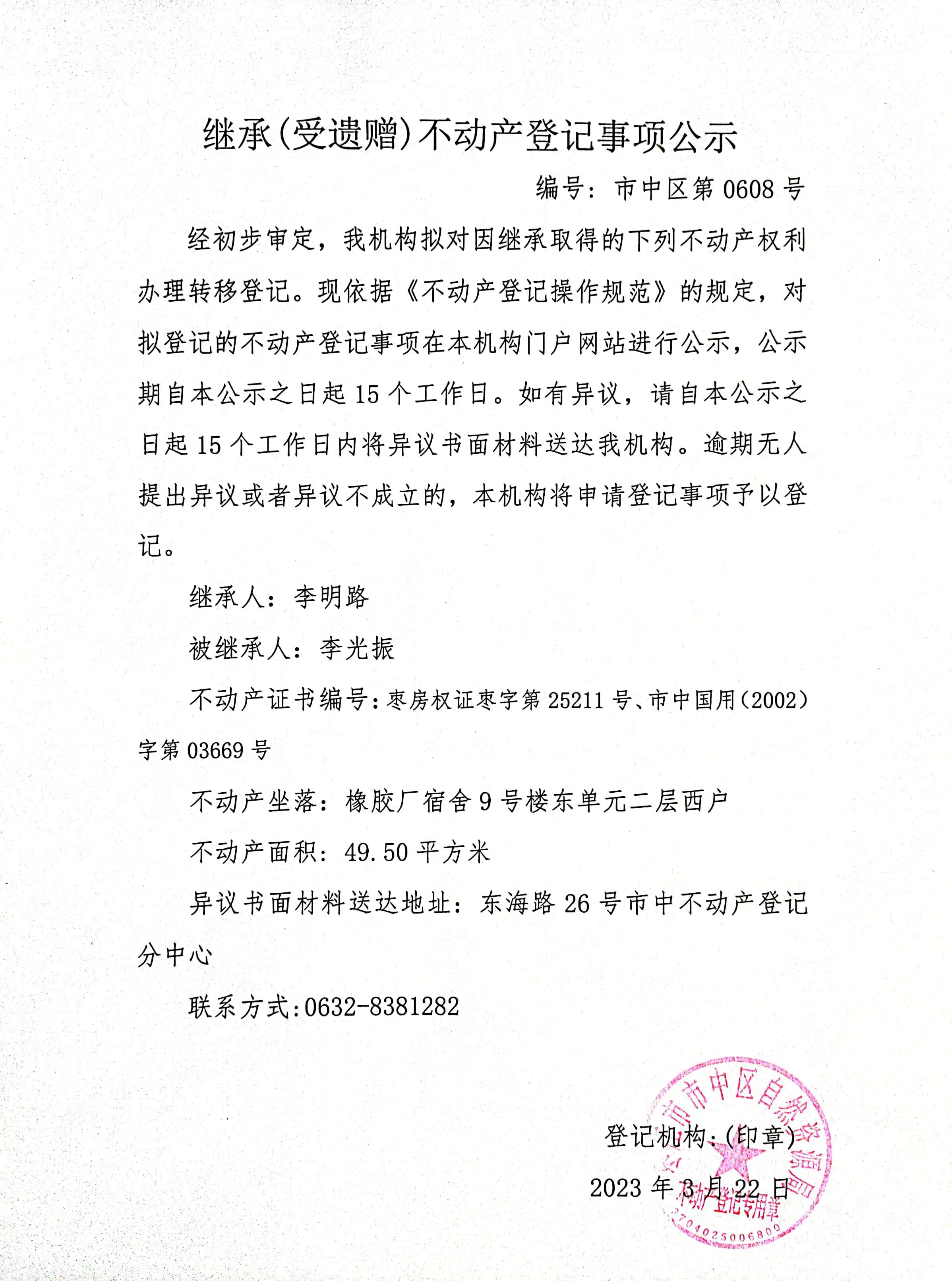 继承(受遗赠)不动产登记事项公示(李明路)