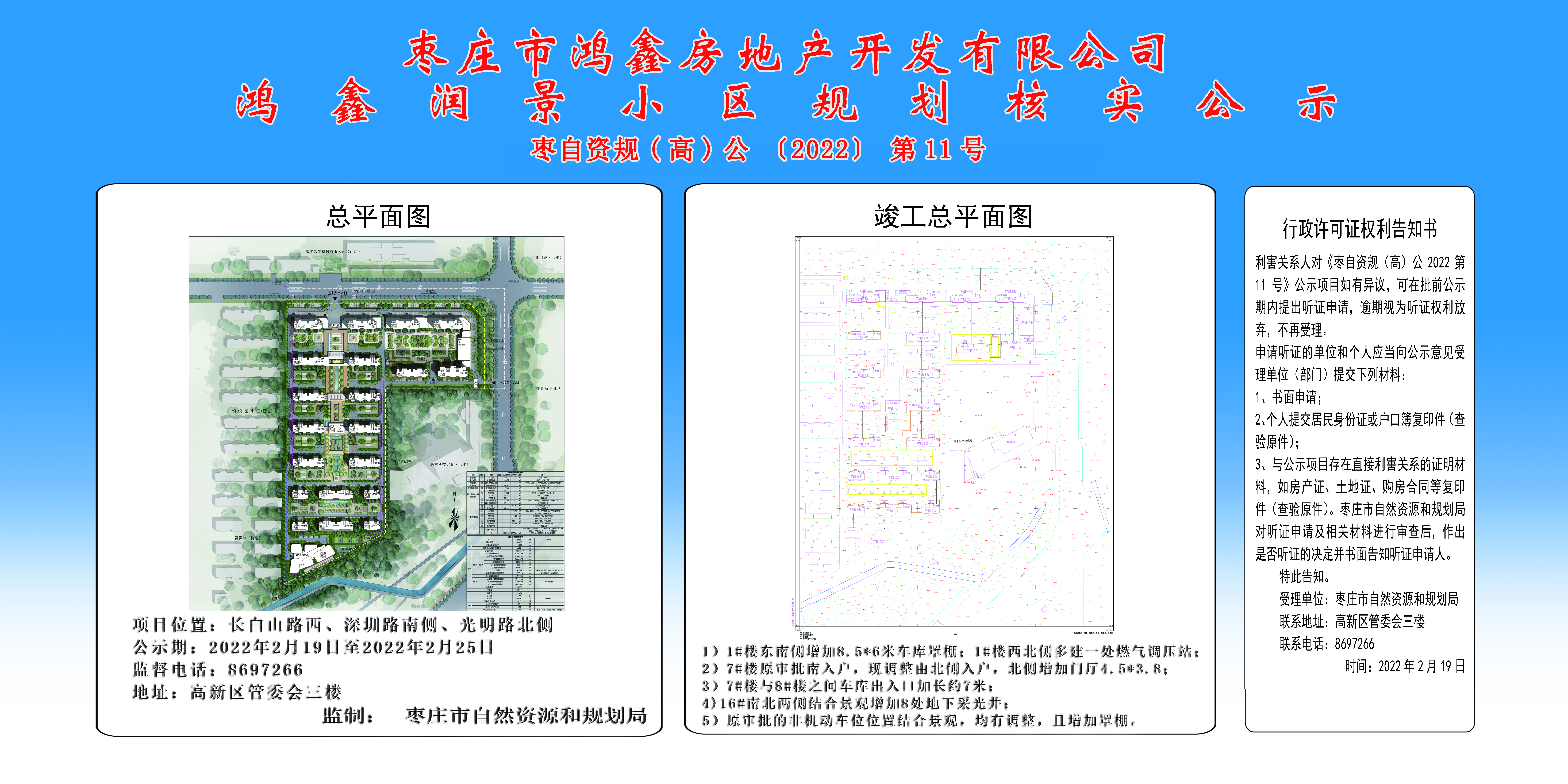 公示项目名称:枣庄市鸿鑫房地产开发有限公司鸿鑫润景小区规划核实批前公示