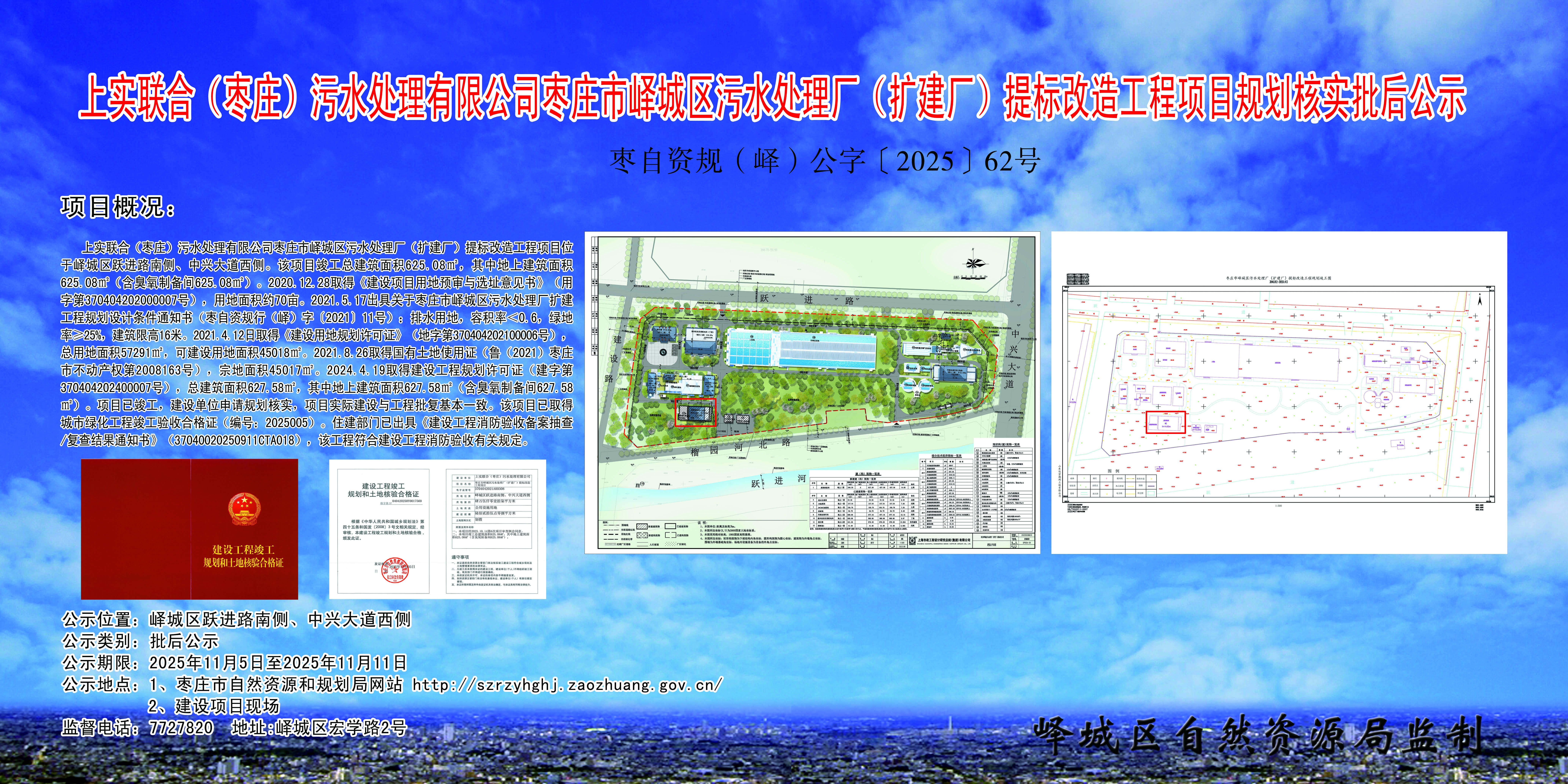 公示项目名称:上实联合(枣庄)污水处理有限公司枣庄市峄城区污水处理厂(扩建厂)提标改造工程项目规划核实批后公示