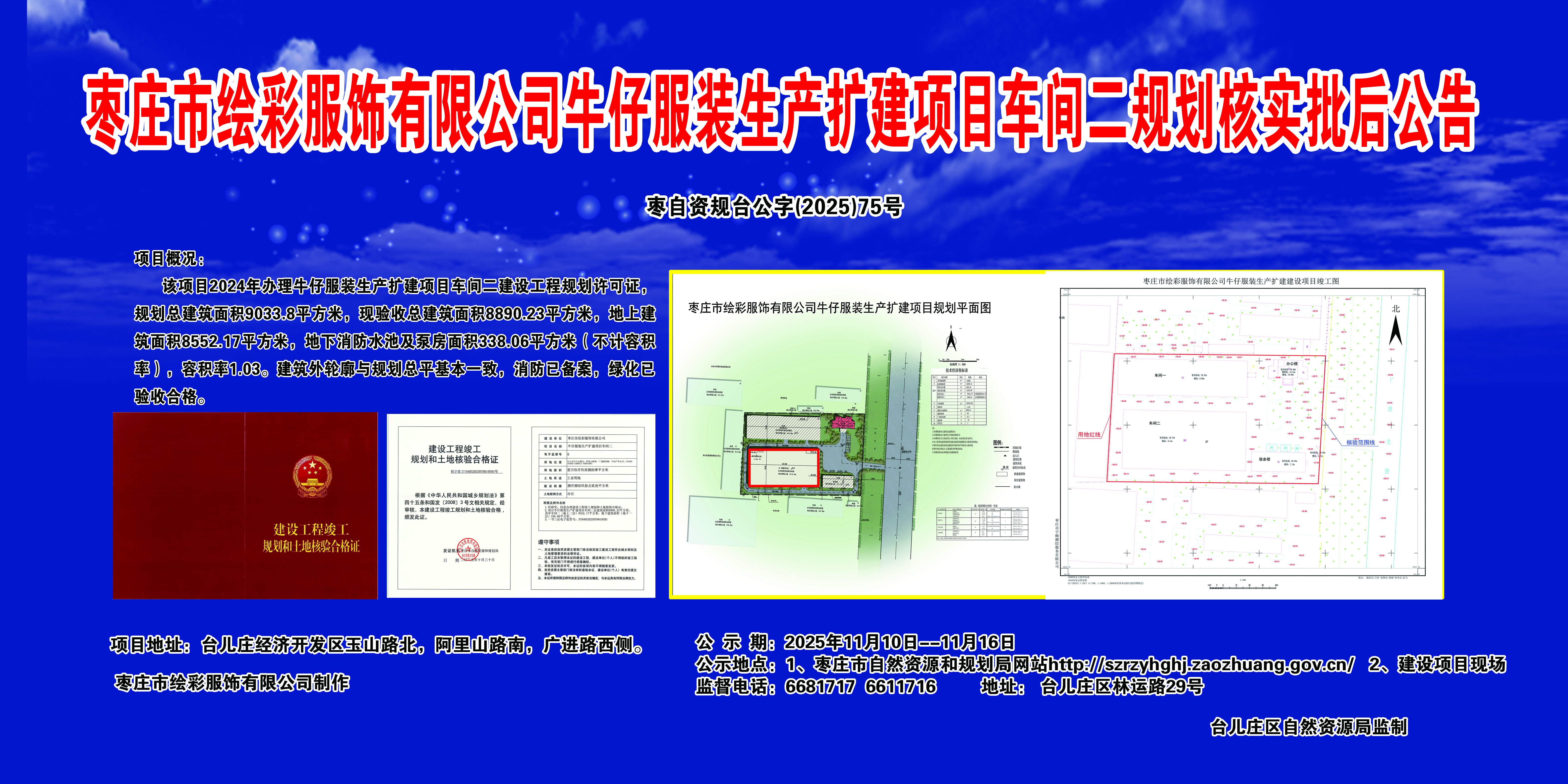 【公示项目名称】枣庄市绘彩服饰有限公司牛仔服装生产扩建项目车间二规划核实批后公告