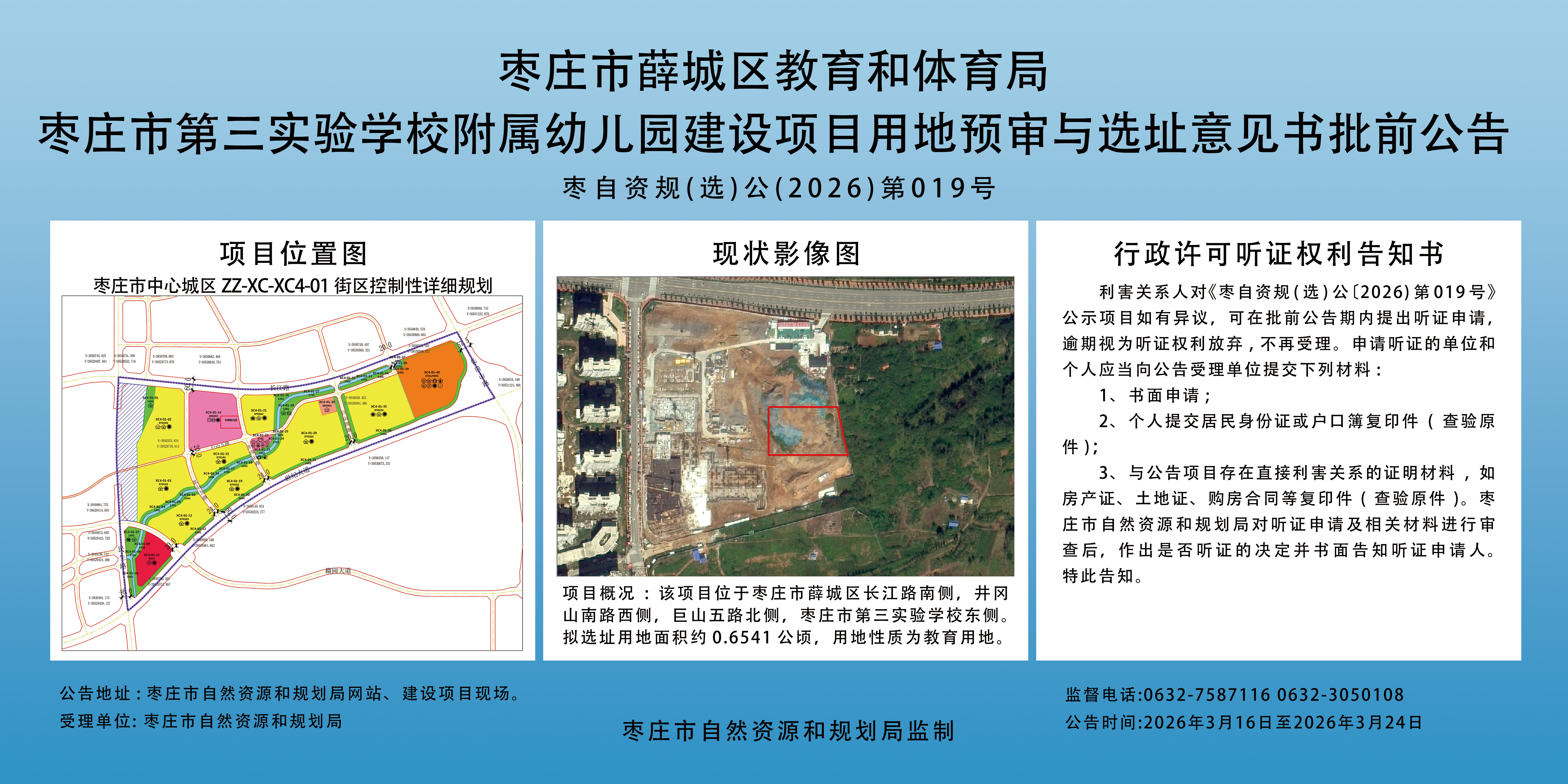 项目概况:该项目位于薛城区长江路南侧、井冈山南路西侧、巨山五路北侧、枣庄市第三实验学校东侧,拟选址用地面积约0.6541公顷,用地性质为教育用地。