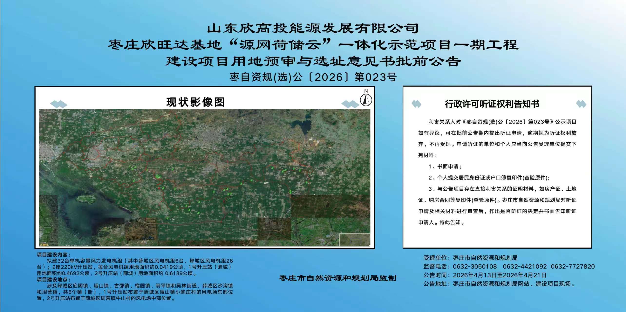 枣庄欣旺达基地“源网荷储云”一体化示范项目一期工程建设项目用地预审与选址意见书批前公告