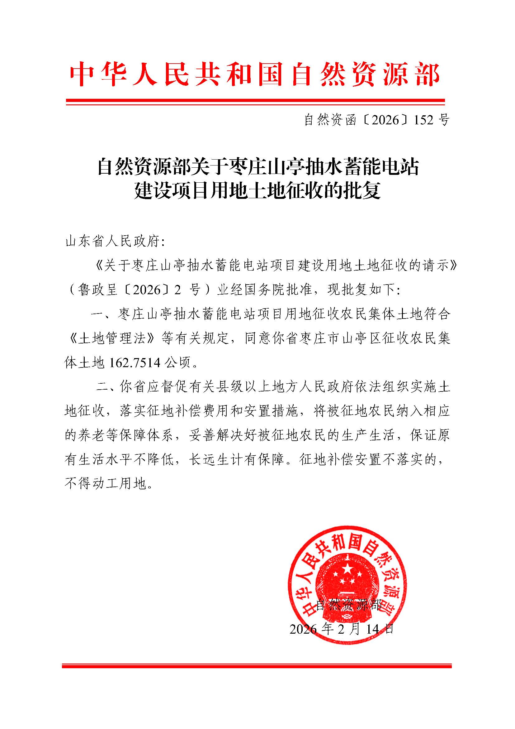 2月28日,我局接省自然资源厅转来《自然资源部关于枣庄山亭抽水蓄能电站建设项目用地土地征收的批复》(自然资函〔2026〕152号),国务院批准枣庄山亭抽水蓄能电站项目建设用地面积162.7514公顷。在项目推进过程中,我局始终以重大项目要素保障为导向,多措并举,全力做好用地保障工作。