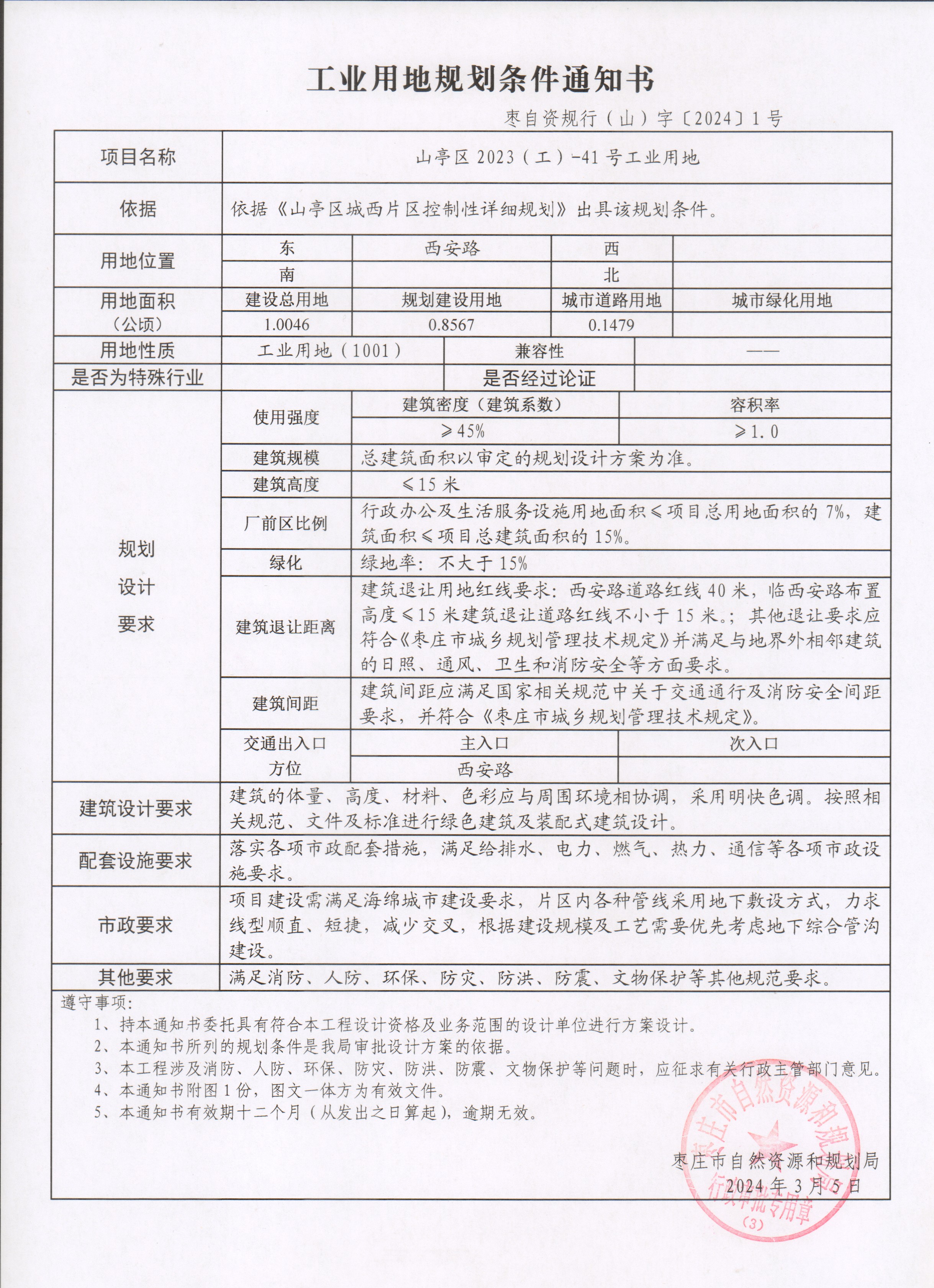 备注:1、根据《枣庄市人民政府关于推进国有建设用地考古前置工作的实施意见》,鉴于地下文物埋藏的复杂性和不可预知性,在该宗土地上开展工程建设过程中如发现文物,应立即停止施工,依法做好文物保护,并及时报告文物行政部门和公安机关;2、受让人签订出让合同之日起60日内交清全部土地出让金;3、严格按照枣自资规行(山)字〔2024〕1号文件规划要求执行。 | |||||||||||||||||