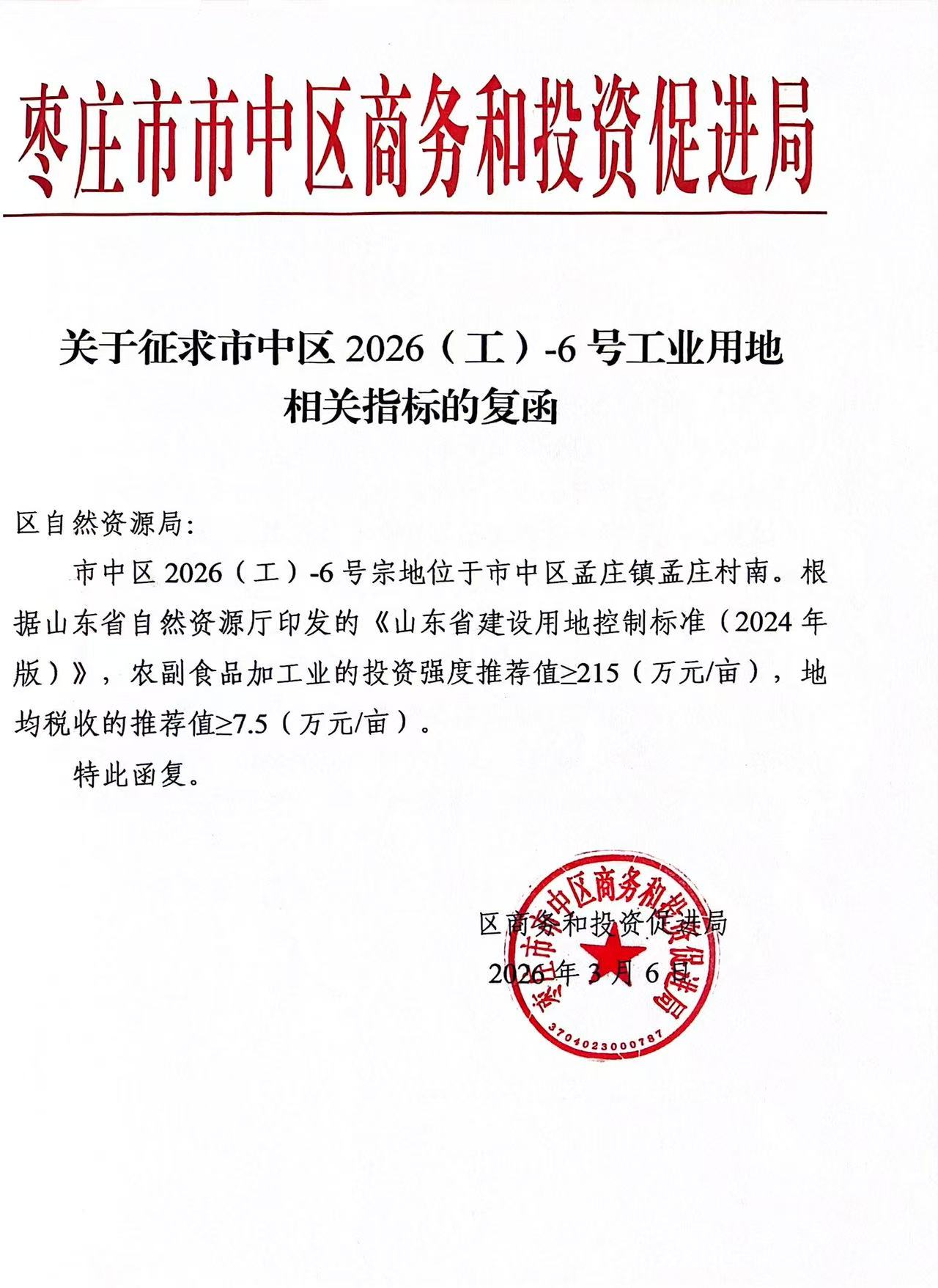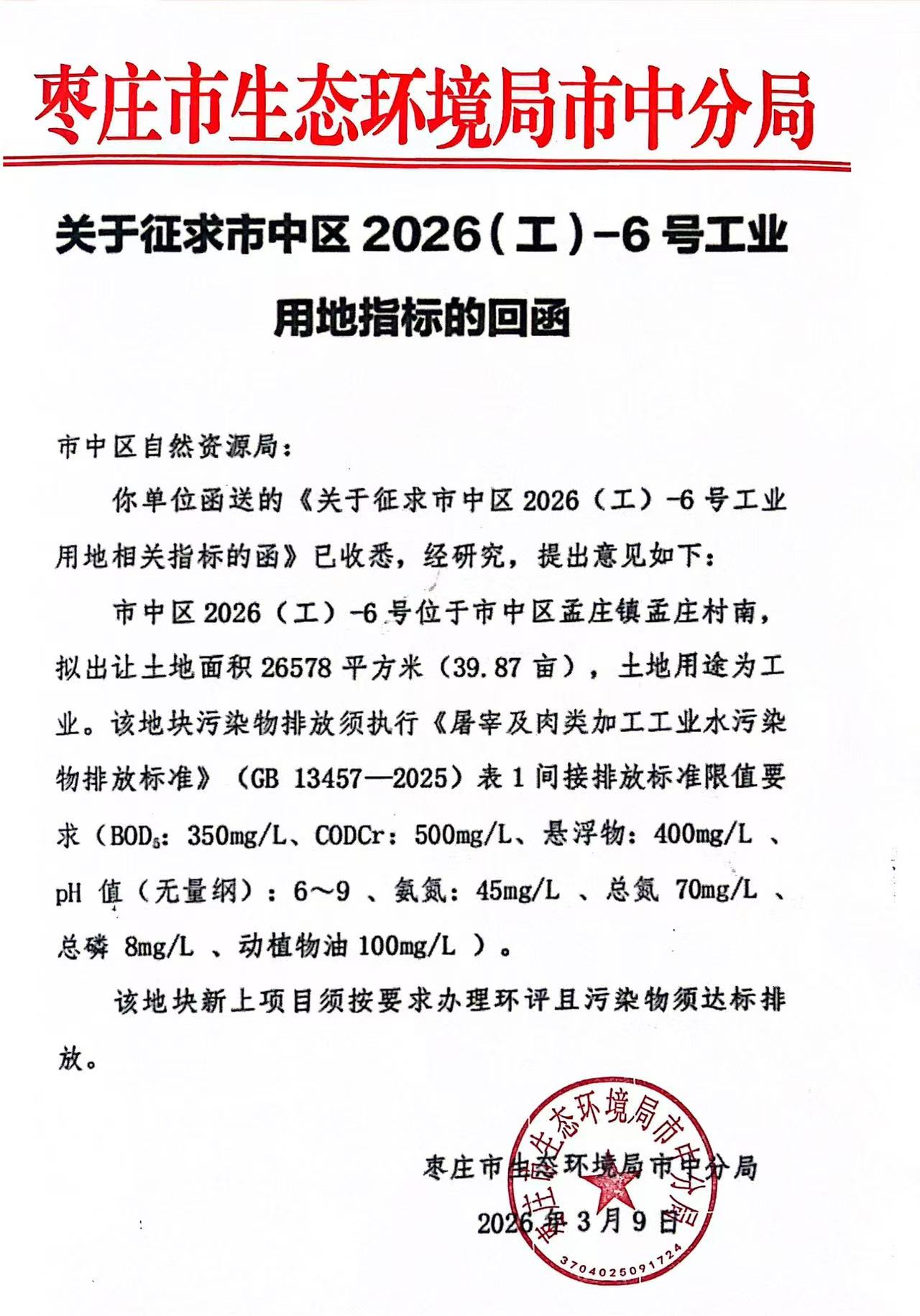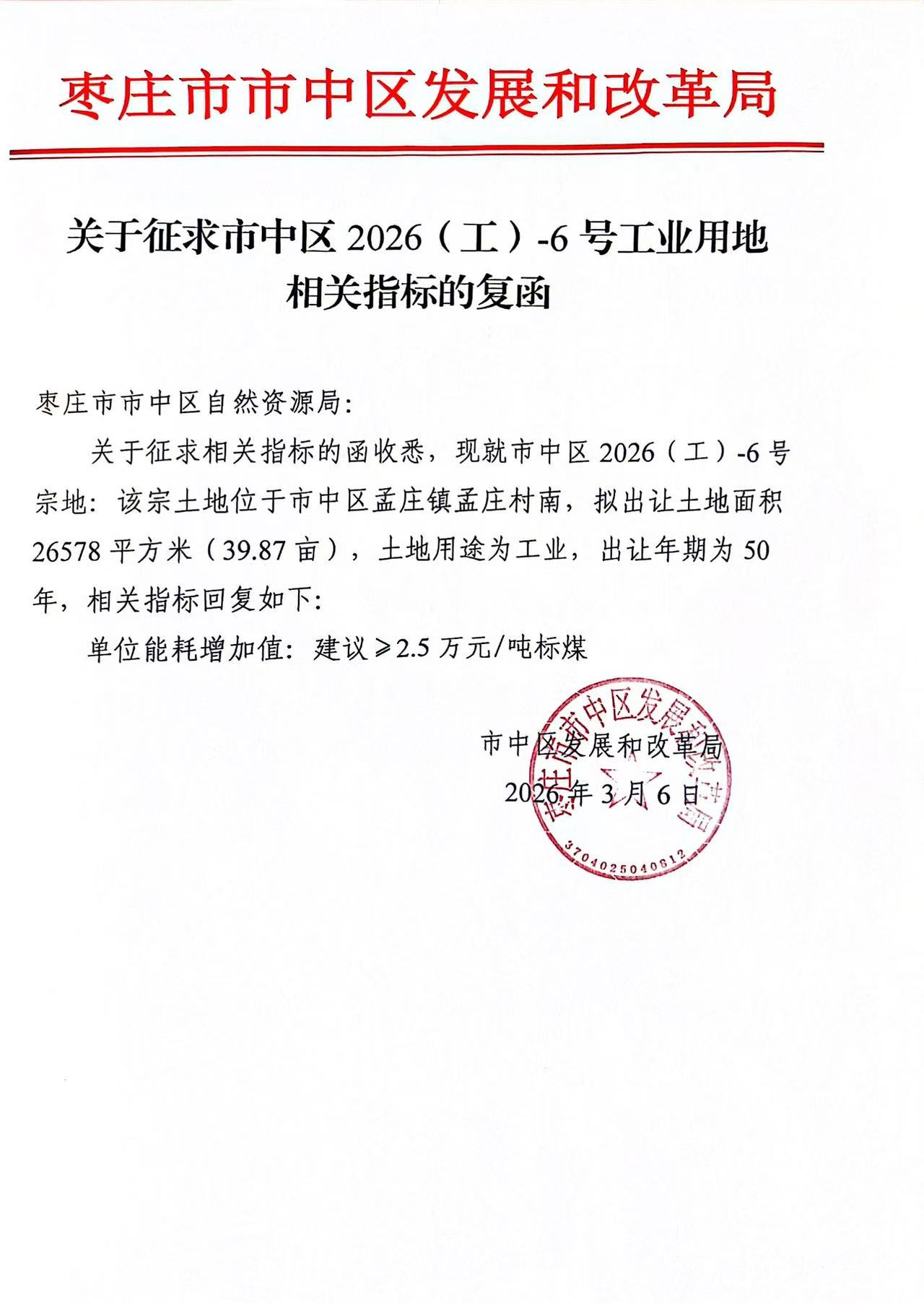 备注:1、该宗工业用地需严格按照规划条件枣自资规行(市中)字〔2026〕8号《工业用地规划条件通知书》执行。2、涉及文物保护内容,按照《山东省文物保护条例》等有关的法律法规和规定执行。3、受让人签订出让合同之日起60日内交清全部土地出让金。4、该宗地建设项目准入条件须严格按照市中区发展和改革局、枣庄市生态环境局市中分局、市中区商务和投资促进局相关要求,详情见附件。 | |||||||||||||||