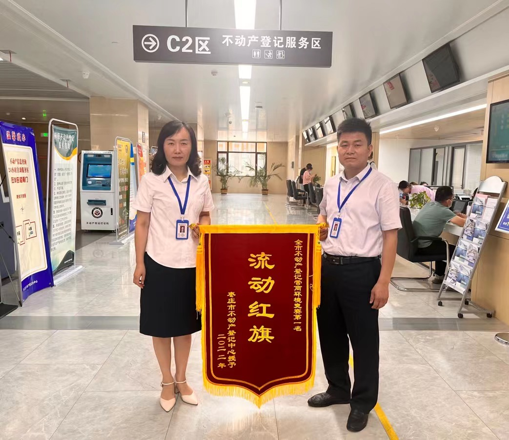 近日,台儿庄不动产登记分中心在全市组织开展的营商环境“流动红旗”“党员示范岗”“服务标兵”竞赛活动中,以工作考核(一季度)总分排名第一的成绩,被授予“流动红旗”单位,分中心工作人员郭传英、姜丹丹、李欣悦分别被授予“党员示范岗”“服务标兵”荣誉称号。
