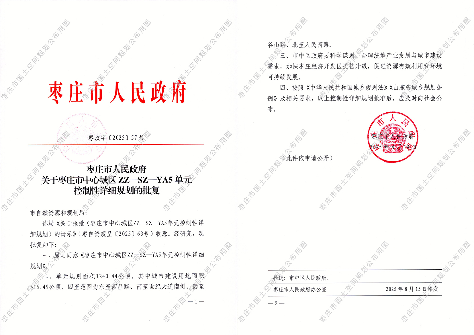 《枣庄市中心城区ZZ-SZ-YA5单元控制性详细规划》 批后公布